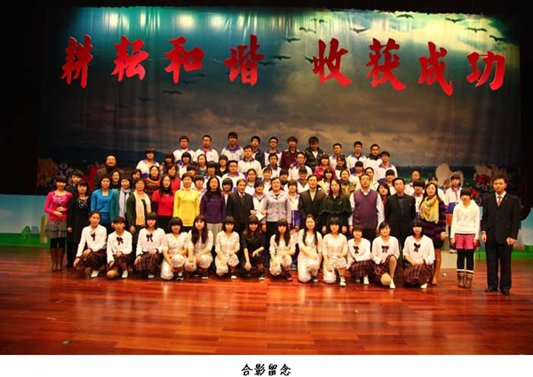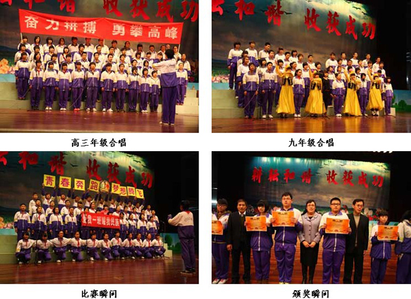 從12月初的啟動活動到12月中旬的初賽,各個班級緊鑼密鼓的籌備。2011年12月31日上午進行決賽,18個比賽班級經(jīng)過激烈角逐評出一等獎4名,二等獎6名,三等獎8名,畢業(yè)班獲紀(jì)念獎。每個班級精心選擇曲目,《青春舞曲》、《國家》、《愛我中華》、《相親相愛》等大家耳熟能詳?shù)母枨蔀閰①惖臒衢T曲目。比賽中,各參賽班級演唱形式多樣,各具特色,同學(xué)們精神飽滿、充滿激情,表達了對祖國,對學(xué)校由衷地?zé)釔叟c贊美。我校霞光少年民樂團和校街舞社團也在聯(lián)歡會上展示了他們的風(fēng)采,我校高二一班重新填詞的歌曲《民族歡迎你》唱出了民族學(xué)子對學(xué)校對班集體的熱愛之情,高二7班李楊老師與同學(xué)們合唱的歌曲《夢的怒放》展現(xiàn)了師生的和諧融洽,一曲曲激情澎湃的演繹,一首首催人奮進的歌曲,深深感染了在場的每一名觀眾。
