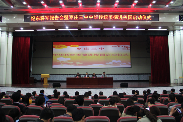 2014年4 月18 日,為扎實開展好黨的群眾路線教育實踐活動,提高黨員干部的思想政治素質(zhì),強化黨性修養(yǎng),轉(zhuǎn)變工作作風(fēng),棗莊三中舉辦黨的群眾路線教育實踐活動專題報告會。原武警指揮學(xué)院副院長、周恩來鄧穎超研究中心顧問、周總理生前秘書紀(jì)東少將應(yīng)學(xué)校邀請,在三中西校報告廳為800 余名師生作了題為“弘揚周總理精神風(fēng)范,樹立正確的人生價值觀” 專題報告。