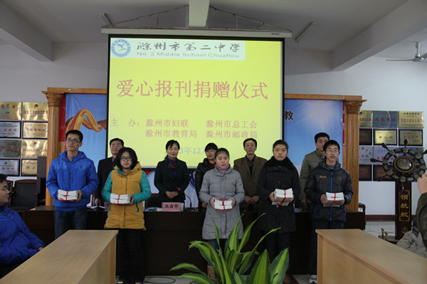 2013年12月6日,滁州二中行政三樓會(huì)議室陣陣暖意,由市教育局、市婦聯(lián)、市總工會(huì)、市郵政局聯(lián)合組織的愛(ài)心報(bào)刊捐贈(zèng)儀式在這里舉行,滁州二中宏志班學(xué)生代表接受了價(jià)值15600元的愛(ài)心報(bào)刊。市婦聯(lián)副主席高春芳、市總工會(huì)副主席王繼亮、市教育局副局長(zhǎng)周愛(ài)勤、市郵政局副局長(zhǎng)季剛等領(lǐng)導(dǎo)出席了捐贈(zèng)儀式。我校張大銀校長(zhǎng)、胡剛副校長(zhǎng)及工會(huì)、辦公室、高三年級(jí)組負(fù)責(zé)人參加了捐贈(zèng)儀式。儀式由市婦聯(lián)副主席高春芳主持,張大銀校長(zhǎng)代表學(xué)校致答謝詞,市教育局周愛(ài)勤副局長(zhǎng)作了總結(jié)發(fā)言。