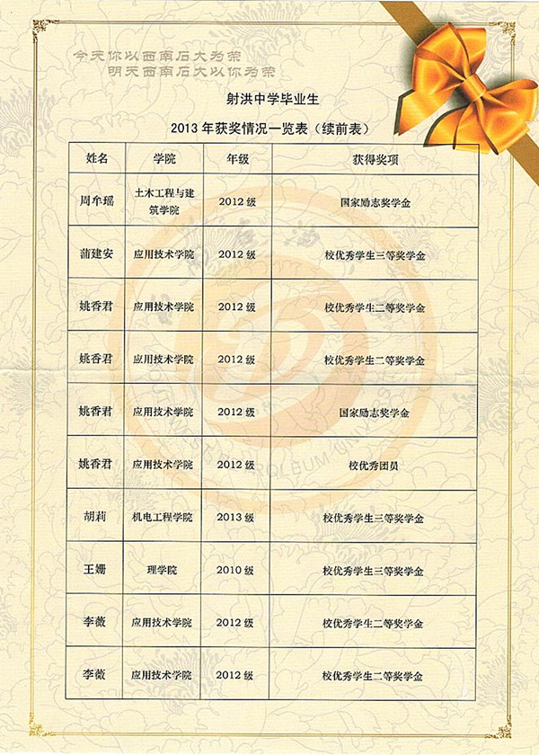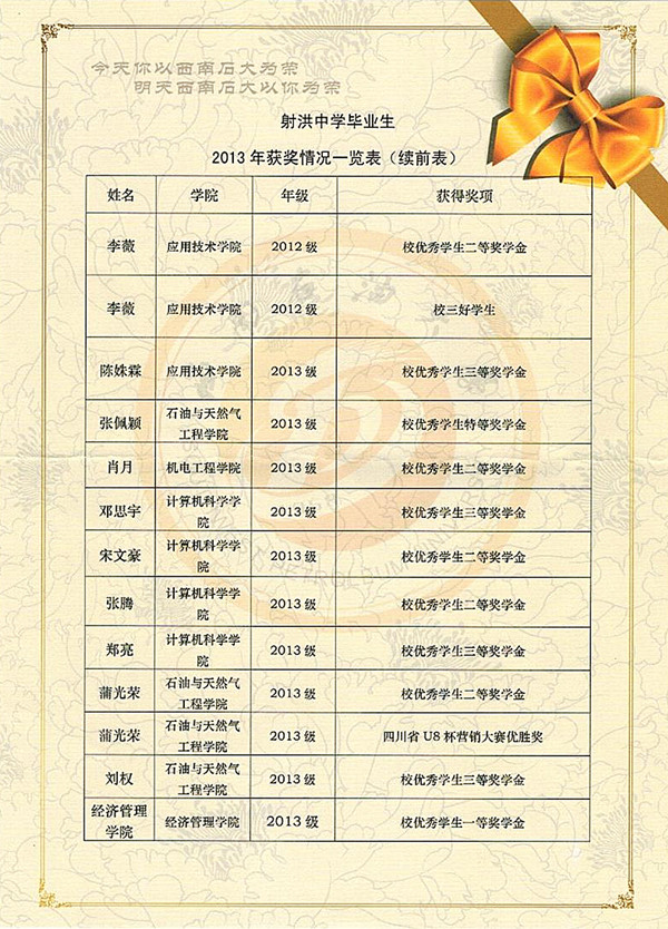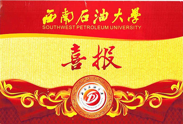 近年,我校為西南石油大學(xué)輸送了眾多優(yōu)秀高中畢業(yè)生。這些學(xué)生在西南石油大學(xué)學(xué)習(xí)成績優(yōu)秀,表現(xiàn)突出,獲得了多項獎勵。2014年6月,西南石油大學(xué)特向我校寄來喜報。