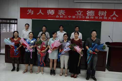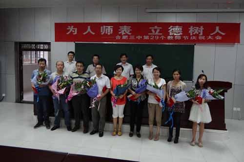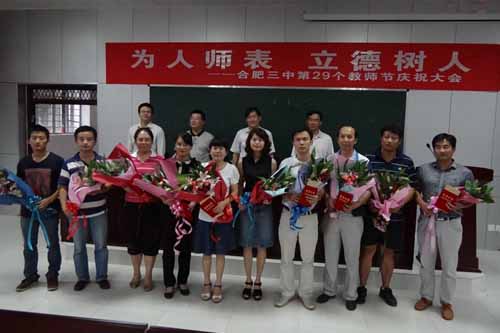 秋風(fēng)送爽,丹桂飄香,共和國(guó)第29個(gè)教師節(jié)如約而至。2013年9月10日下午5:30,合肥三中慶祝第29個(gè)教師節(jié)大會(huì)在階梯教室隆重舉行,全校教職工和學(xué)生代表參加了的本次慶祝大會(huì),會(huì)議由冬云副校長(zhǎng)主持。