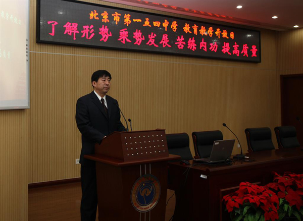2014年4月14日上午8:30——12:00,我校開展了教育教學(xué)開放日活動(dòng)。參加開放日的嘉賓有原宣武區(qū)教育學(xué)院院長(zhǎng)萬(wàn)福,“高效課堂”協(xié)作網(wǎng)秘書長(zhǎng)于新北,副秘書長(zhǎng)張玥,和西城、海淀、通州、豐臺(tái)、順義、房山、朝陽(yáng)、密云各區(qū)縣兄弟學(xué)校及河南鶴壁高中等18所學(xué)校的領(lǐng)導(dǎo)、教師共150多人,以及近30位學(xué)生家長(zhǎng)。