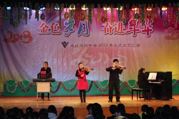 2012年,學校以“腳踏實地,拼搏必勝”的精神譜寫了一曲金色的樂章。在元旦文藝匯演上,張再生校長代表學校致辭,對2012年學校與學生取得的成績給予了高度的肯定,向全體師生表達了新年美好的祝福。在辭舊迎新之際,張校長更以激勵的話語鼓勵全體鹽高人繼續(xù)以奮進的姿態(tài)扎實工作,努力學習,創(chuàng)造嶄新的成績,書寫2013年的精彩。