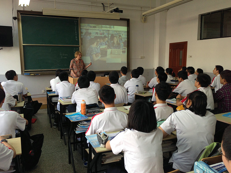 張志敏校長(zhǎng)和王麗萍書記熱情接見來訪的老師,雙方對(duì)兩校多年長(zhǎng)期的友誼感觸頗深。張校長(zhǎng)向來賓介紹了格致中學(xué)即將落成的新校區(qū),寄希望兩校能就課程、尤其是環(huán)境類課程進(jìn)行深入合作共享,并邀請(qǐng)PLC校長(zhǎng)明年格致建校140周年之際來訪我校。王麗萍書記向來賓展示了新校區(qū)的效果圖,祝愿兩校友誼長(zhǎng)存。Helena Dunn女士和Susan Renney女士對(duì)接待安排向格致中學(xué)表達(dá)謝意,同時(shí)歡迎格致中學(xué)的師生到PLC交流訪問。