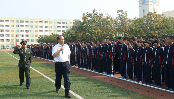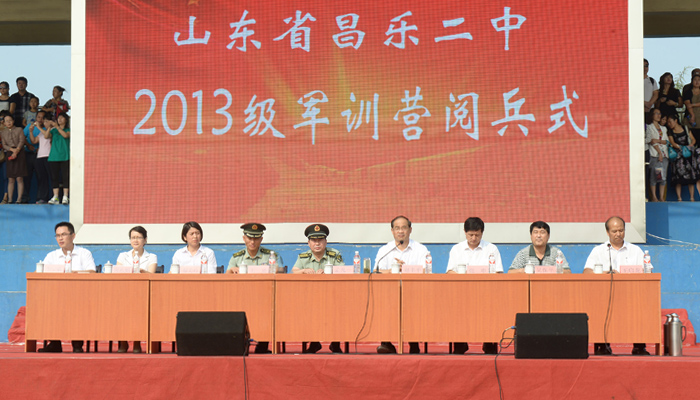 9月14日,山東省昌樂二中主體育場上掌聲雷動(dòng),口號震天。山東省昌樂二中2013級軍訓(xùn)營閱兵式正在這里隆重舉行。閱兵式由政教處主任王啟龍主持,駐濰某部首長孟凡一同志,昌樂二中校長趙豐平,駐濰某部營長王勇同志,昌樂二中執(zhí)行校長張申,昌樂二中副校長郝美玲、2013級家長代表吳保平、田永娟,高一年級包級主任李寶森受邀在主席臺就坐,和全體高一學(xué)生家長一起對軍訓(xùn)成果進(jìn)行了檢閱。