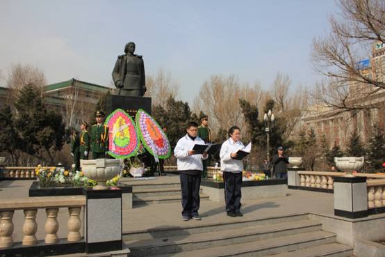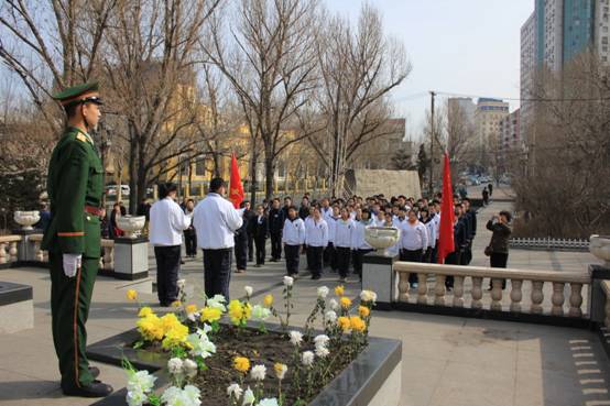 清明時(shí)節(jié),寄哀思。哈三中志愿者在團(tuán)委書(shū)記 何顯貴 老師的帶領(lǐng)下于 2013 年 4 月 4 日上午 9 時(shí) ,來(lái)到一曼街趙一曼烈士紀(jì)念碑前,清掃了烈士墓周邊的環(huán)境,敬獻(xiàn)了花圈,并參觀了東北烈士紀(jì)念館、東北抗聯(lián)博物館、黑龍江革命博物館。趙文祥校長(zhǎng)出席并參加了整個(gè)祭掃活動(dòng)。
