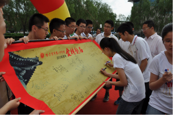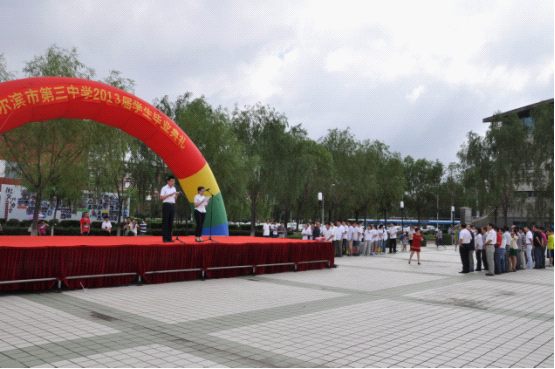 2013 年 7 月 5 日早 7 : 30 , 2013 屆學(xué)生畢業(yè)典禮在群力校區(qū)普育廣場舉行。典禮上,對優(yōu)秀畢業(yè)生和高考中取得優(yōu)異成績的同學(xué)進(jìn)行了表彰,并簽寫了題名金榜。潘可涵同學(xué)代表全體畢業(yè)生、閆琳虹老師代表全體教師、趙文祥校長代表學(xué)校,分別進(jìn)行了發(fā)言。