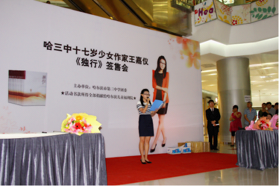 2013年7月13日下午1::00—2:30,我校高二·十六班學(xué)生王嘉儀的《獨(dú)行》簽售會在凱德廣場·學(xué)府舉行。該活動由我校團(tuán)委主辦,當(dāng)天所得書款全部捐獻(xiàn)給哈爾濱兒童福利院。出席簽售會的有校長趙文祥、團(tuán)委書記何顯貴、哈爾濱兒童福利院副院長王紹龍、原黑龍江人民出版社副社長,《獨(dú)行》的責(zé)任編輯,資深編審陳懇老師。嘉賓分別發(fā)言,王嘉儀作了精彩演講。整個簽售活動熱鬧、有序。有我校及其他學(xué)校的高中學(xué)子、有初中生,也有父母領(lǐng)來的小學(xué)生。大家一方面參與了文化活動,分享了讀書的快樂,同時參與了公益活動,豐富了社會實(shí)踐。