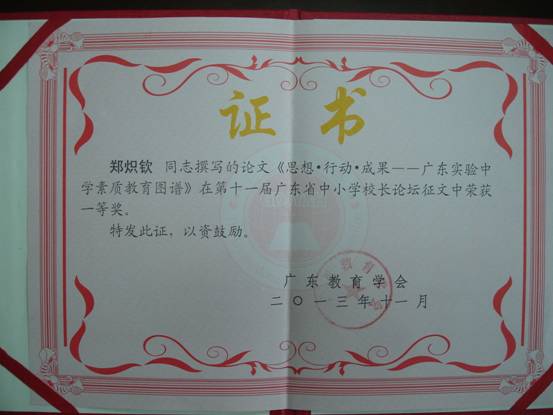 近日,在由廣東教育學會組織的第十一屆廣東省中小學校長論壇征文活動中,我校鄭熾欽校長撰寫的《思想·行動·成果——廣東實驗中學素質教育圖譜》榮獲一等獎。
