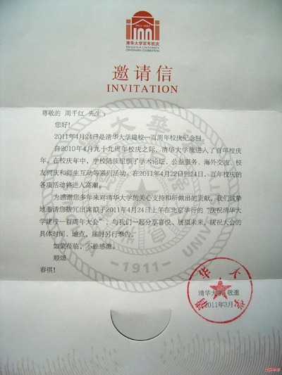 受清華大學(xué)的邀請,周千紅校長出席了清華大學(xué)百年校慶活動(dòng)。2011年4月24日上午10:00,參加了在人民大會(huì)堂舉行的“慶祝清華大學(xué)建校一百周年大會(huì)”。中午,在人民大會(huì)堂宴會(huì)廳,清華大學(xué)校長顧秉林院士宴請了受邀的各位中外高校及中學(xué)校長。