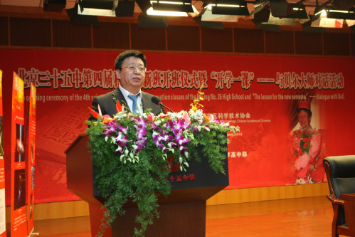 主持人科技班學(xué)生馬鵬恒、張睿林身穿禮服,分別用中英文宣布“第四屆科技班開班儀式暨‘開學(xué)一課’”開始。掌聲雷動(dòng)。英國(guó)牛津大學(xué)貝爾教授、國(guó)家天文臺(tái)張承民教授、我校朱建民校長(zhǎng)、中國(guó)科學(xué)院京區(qū)科協(xié)常務(wù)主席袁志寧、中國(guó)科學(xué)院京區(qū)科協(xié)季慧、中國(guó)科學(xué)院京區(qū)科協(xié)王虎紋、西城區(qū)教委副主任任飏、西城區(qū)教委中教科副科長(zhǎng)張潔、我??籽鄷?、黃鵬副校長(zhǎng)、李屆雄副校長(zhǎng)、王紅軍副校長(zhǎng)參加了此次會(huì)議。