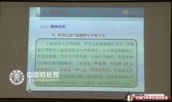 張金豹校長介紹二橋中學(xué)的陽光文化主要從環(huán)境文化、精神文化兩方面內(nèi)容,闡明環(huán)境育人的重要性,目的是為學(xué)生營造一個快樂的學(xué)習(xí)氛圍。