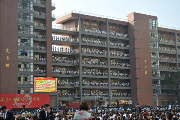 裝飾一新的廈禾校區(qū)在秋陽下顯得喜慶、清新,主樓(高遠(yuǎn)樓)高掛著大紅橫幅“熱烈慶祝廈門六中建校60周年”,30米長的巨幅對聯(lián)寫著“歷經(jīng)六十載風(fēng)云桃李芳園春永駐,凝聚幾代人心血鯤鵬碧海業(yè)終成”,體現(xiàn)六中人應(yīng)有的自信與自豪;所到之處,歌聲笑聲,節(jié)日的氣氛洋溢校園內(nèi)外。