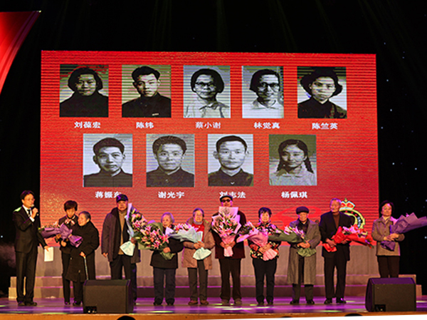 上外附中建校初期的九位老領(lǐng)導(dǎo)、老教師登臺接受少先隊(duì)員鮮花