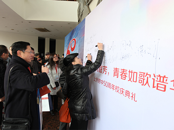 回校的校友及老師們在簽名墻上留下自己的簽名