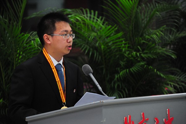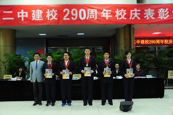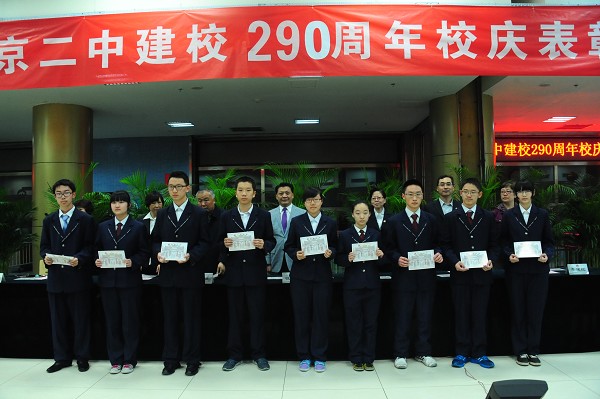 大會(huì)由學(xué)生處冀紅杰主任主持,許柬副校長(zhǎng)宣讀了學(xué)校對(duì)2014年度金銀質(zhì)獎(jiǎng)?wù)碌谋碚脹Q定,鈕校長(zhǎng)等學(xué)校領(lǐng)導(dǎo)為獲獎(jiǎng)同學(xué)頒發(fā)了獎(jiǎng)?wù)?、證書(shū)和勵(lì)勤獎(jiǎng)學(xué)金。表彰大會(huì)共設(shè)金銀質(zhì)獎(jiǎng)?wù)?、科技?jìng)賽獎(jiǎng)、感動(dòng)二中優(yōu)秀學(xué)生及集體獎(jiǎng)、最具特色二中人獎(jiǎng)、進(jìn)校廣播創(chuàng)作獎(jiǎng)五種獎(jiǎng)項(xiàng)。其中,李芃芃、陜思宇等52名同學(xué)獲得金銀質(zhì)獎(jiǎng)?wù)录皠?lì)勤獎(jiǎng)學(xué)金;劉旺宇、張博雅、李自然、趙子翟、董思博等同學(xué)堅(jiān)持科技鉆研,在第三十四屆北京科技創(chuàng)新大賽取得一等獎(jiǎng)的優(yōu)異成績(jī),彭博同學(xué)獲第十二屆北京青少年科技創(chuàng)新市長(zhǎng)獎(jiǎng)的榮譽(yù)稱號(hào);國(guó)際部高二(1)班肖劍橋同學(xué)充分發(fā)揮自身特長(zhǎng)幫助他人、回報(bào)社會(huì),兩年來(lái)堅(jiān)持志愿服務(wù),在公交車(chē)站中英文指路,在民航博物館做義務(wù)講解員,踐行著奉獻(xiàn)、友愛(ài)、互助、進(jìn)步的志愿精神,獲得了感動(dòng)二中優(yōu)秀學(xué)生稱號(hào);高三(2)班三年來(lái)秉承自律、團(tuán)結(jié)、責(zé)任、堅(jiān)持的班級(jí)精神,創(chuàng)造了三年來(lái)摘取全部三十八面衛(wèi)生紅旗的優(yōu)良衛(wèi)生記錄,獲得感動(dòng)二中先進(jìn)集體稱號(hào)。會(huì)上,彭博、肖劍橋等部分獲獎(jiǎng)學(xué)生代表做了精彩發(fā)言,與同學(xué)們分享了他們的學(xué)習(xí)生活感受,他們的動(dòng)人事跡充分詮釋了踏實(shí)、執(zhí)著、奉獻(xiàn)等優(yōu)秀品格,深深地感動(dòng)了在場(chǎng)全體同學(xué),發(fā)揮了良好的榜樣作用。特別值得注意的是,為更好地傳承國(guó)學(xué)文化精髓,踐行二中自由篤行的文化傳統(tǒng),為各方面堅(jiān)持不懈、學(xué)有所長(zhǎng)的同學(xué)搭建成長(zhǎng)的平臺(tái),學(xué)校在本次表彰中特地增設(shè)"最具特色二中人獎(jiǎng)",共分"厚德友愛(ài)"、"博學(xué)雅聞"、"格物致知"、"怡情養(yǎng)性"四項(xiàng),今年共有799名學(xué)生獲獎(jiǎng),占學(xué)校學(xué)生總數(shù)的53%,表現(xiàn)出學(xué)校鼓勵(lì)學(xué)生全面發(fā)展、不斷進(jìn)步的巨大魄力,將會(huì)場(chǎng)氣氛推向了高潮。表彰大會(huì)結(jié)束后,各年級(jí)選送優(yōu)秀節(jié)目進(jìn)行了展演,同學(xué)們用精彩的文藝演出向母校二百九十周年華誕獻(xiàn)上了自己的賀禮,表達(dá)了對(duì)學(xué)校悠久歷史的懷念,對(duì)學(xué)校輝煌未來(lái)的祝福。