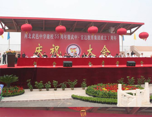 上午9:55 ,河北武邑中學(xué)建校55周年暨武中·宏達(dá)教育集團(tuán)成立1周年慶祝大會(huì)在武中操場舉行。蒞臨大會(huì)的領(lǐng)導(dǎo)有教育部辦公廳副主任高聚慧同志,教育部職成教司司長張昭文同志,原省政協(xié)副主席王滿秋同志,省委副秘書長、校友劉志信同志,原衡水地委書記喬世忠同志,省教育廳副廳長張益祿同志,省地勘局副局長靳海河同志,原民政廳副廳長李丙起同志,省社科院副院長、校友趙金山同志,省教育廳裝備處處長郭國衛(wèi)同志,省教育廳師教處處長張戰(zhàn)英同志,省司法廳政治部主任趙秀淼同志,省監(jiān)察廳三室主任李占領(lǐng)同志,市委副書記李曉明同志,市人大副主任楊金鎖同志,市政協(xié)副主席郭金強(qiáng)同志、王云英同志,原地委副書記、校友李書昌同志,原地委委員、常務(wù)副專員孫木森同志,原市人大副主任王智明同志,中國電力投資總公司江西分公司副總經(jīng)理、校友靳東來同志,中房集團(tuán)總經(jīng)理助理、校友孟萬河同志,縣委書記王金剛、縣長羅志強(qiáng)等四大班子領(lǐng)導(dǎo)同志。