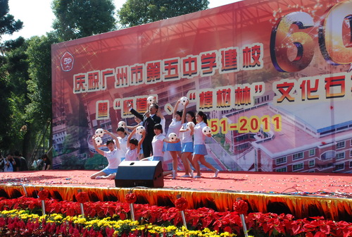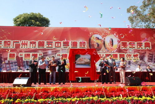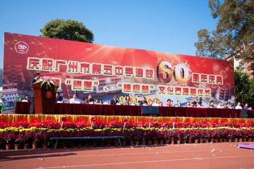 2011年11月27日 ,在這個陽光明媚的日子,我們迎來了廣州市第五中學的六十華誕。中國足協(xié)副主席容志行,廣州市委宣傳部副部長葉敏,廣州市教育局副局長吳強出席了廣州市第五中學60周年校慶儀式,區(qū)人大馮舶副主任,區(qū)政府江帆副區(qū)長,區(qū)政協(xié)副主席黃信儀、劉金鵬等區(qū)領導應邀到賀。各屆校友也從祖國乃至世界各地回到五中,為母校慶生,場面之盛大,氣氛之感人,可以說是空前的。