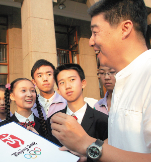 “這里是我夢(mèng)開始的地方?!币粋€(gè)手捧2008年北京奧運(yùn)會(huì)會(huì)徽展示圖的中年人說。他就是第一中學(xué)1975屆校友郭春寧,2008年北京奧運(yùn)會(huì)會(huì)徽的主創(chuàng)者。