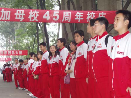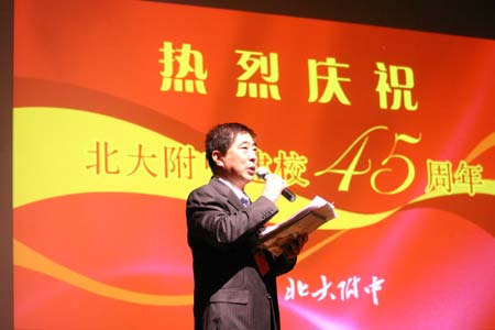 10月6日北京大學(xué)附屬中學(xué)舉行了建校四十五周年慶典活動,3000多名校友(根據(jù)簽到統(tǒng)計(jì)結(jié)果)從海內(nèi)外相聚母校。10點(diǎn)整校慶大會正式開始。與會的來賓有海淀區(qū)的教委領(lǐng)導(dǎo)、北京大學(xué)的教委領(lǐng)導(dǎo)、北大附中的歷屆校長、現(xiàn)任校長、外籍校友和校友代表。在會上,與會來賓都慷慨呈辭,表達(dá)了他們對北大附中的愛與期待。