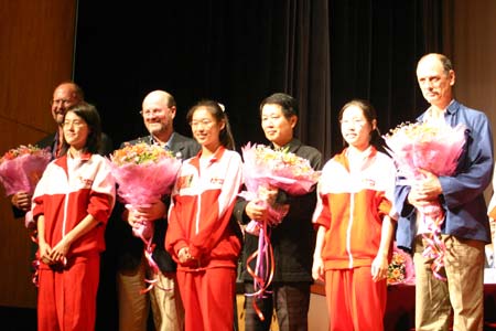 校友代表鳳凰衛(wèi)視的主持人陳曉楠通過對附中生活的回顧,表達(dá)了對附中真切的近鄉(xiāng)之情。外籍校友柯瑪凱等人用流利的中文表達(dá)了對母校開放式的教學(xué)風(fēng)格的贊賞。為慶祝北大附中45周歲生日,中共新疆昌吉回族自治州委員會發(fā)來賀信,并不遠(yuǎn)萬里,送給北大附中一座硅化木化石。全國人大副委員長許嘉璐以一首詩表達(dá)了對附中的祝福:雖依喬木自成春,葉茂枝繁覆萬人,桃李無言勤自勉,花期不負(fù)艷陽晨。