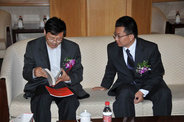 演出開(kāi)始前,蘇旭勇校長(zhǎng)(右)向陳東生局長(zhǎng)介紹校慶畫冊(cè)