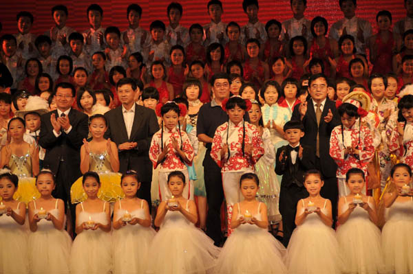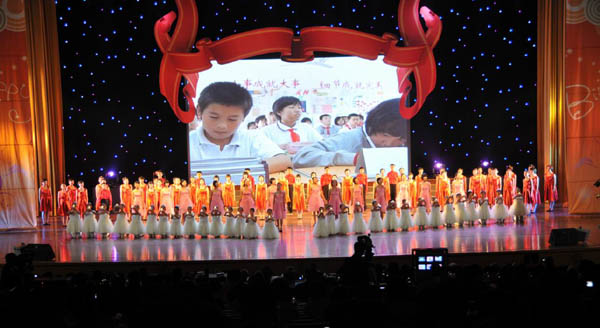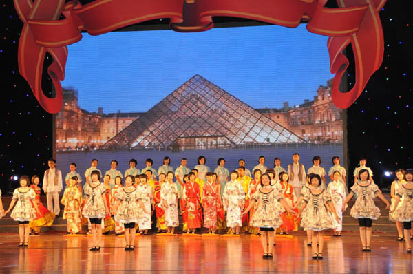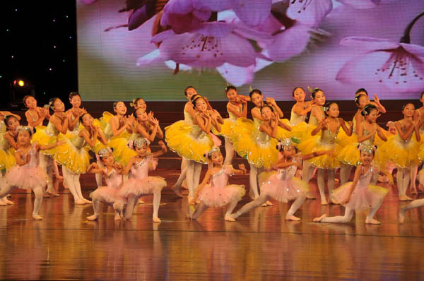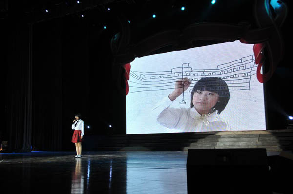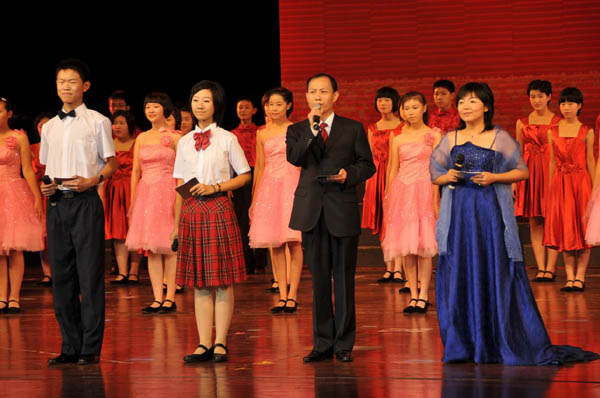 下午3時(shí),伴隨震撼人心的20響鐘聲,舞臺(tái)屏幕依次閃現(xiàn)從1989到2009的年份數(shù)字,演出在磅礴氣勢(shì)中拉開(kāi)帷幕。小學(xué)部舞蹈《歡樂(lè)家園》作為第一個(gè)節(jié)目便將整場(chǎng)演出帶進(jìn)了熱烈歡慶的氛圍中。表演唱《可愛(ài)的家》巧妙明快地再現(xiàn)了濟(jì)南外國(guó)語(yǔ)學(xué)校20年發(fā)展歷程。由姚重遠(yuǎn)老師撰稿的配樂(lè)詩(shī)朗誦《歲月如歌》讓大家穿越時(shí)光隧道,回首歷史,心靈激蕩;展望未來(lái),豪情滿懷。六位朗誦者情真意切的傾訴,大屏幕上配合放映的濟(jì)外照片使在場(chǎng)觀眾產(chǎn)生了強(qiáng)烈共鳴。
