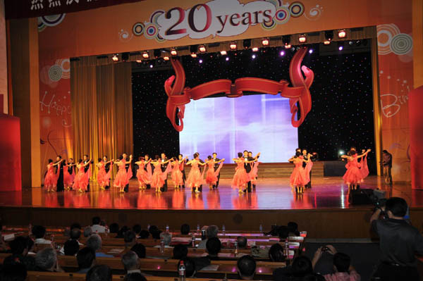 進(jìn)入演出大廳,舞臺(tái)上寫有“慶祝濟(jì)南外國(guó)語(yǔ)學(xué)校建校20周年”文字的大型電子屏幕首先映入眼簾,舞臺(tái)兩側(cè)屏幕“衷心感謝社會(huì)各界對(duì)學(xué)校發(fā)展的熱情支持與大力幫助”、“祝愿全體教師身體健康,家庭幸福、美滿”等內(nèi)容滾動(dòng)播出,“堅(jiān)持科學(xué)發(fā)展,突出辦學(xué)特色,為實(shí)現(xiàn)學(xué)校發(fā)展新跨越而努力奮斗!”的巨幅標(biāo)語(yǔ)懸掛二樓前壁,現(xiàn)場(chǎng)氣氛喜慶而莊重。