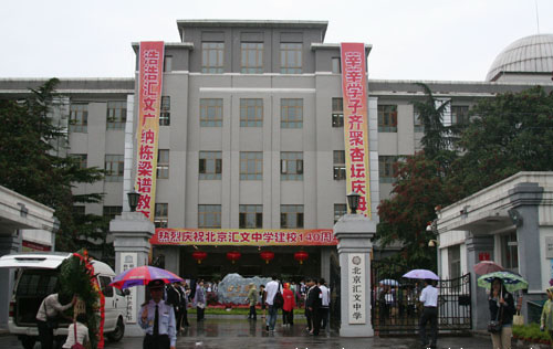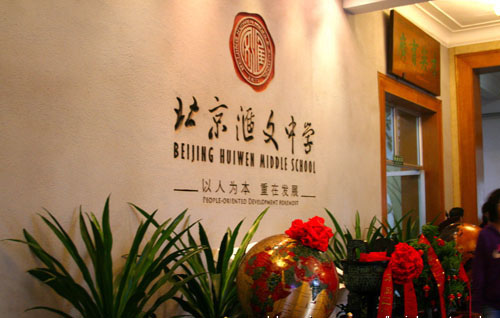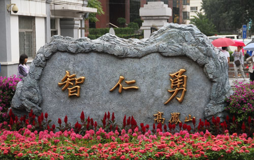 走進(jìn)校門,就看到迎賓石上金燦燦的、蒼勁有力的幾個中英文大字“北京匯文中學(xué)”,背面是高鳳山的題字“智仁勇”,頗有一番文化韻味。迎賓石周圍是各色的鮮花,熱情的紅,嬌艷的粉,晶瑩的黃,浪漫的紫,百花綻放,芬芳怡人。