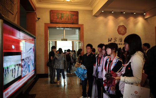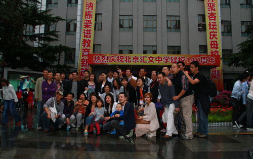 “莘莘學(xué)子齊聚杏壇慶母校華誕,浩浩匯文廣納棟梁譜教育新篇”正對校門的教學(xué)樓上這幅偌大的對聯(lián)分外醒目,橫聯(lián)是“熱烈慶祝北京匯文中學(xué)建校140周年”,校友們還沒進(jìn)校門就開始留影了。學(xué)生志愿者迎著細(xì)雨,在校門口列隊歡迎,安排各屆校友簽到、領(lǐng)取紀(jì)念品、到簽名墻簽名、校友團(tuán)聚等。