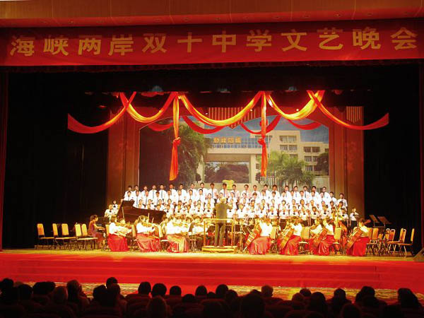 此次晚會,是兩岸雙十的一次聯(lián)袂演出。臺灣臺中的雙十中學(xué)組成一個(gè)規(guī)模龐大的管弦樂團(tuán),跨海特來為廈門雙十校慶傾情演出,成為廈門雙十中學(xué)90華誕收到的最厚重的賀禮之一。雙方你演唱我伴奏,你指揮我演奏,濃濃的友誼彌漫于整個(gè)晚會的始終。